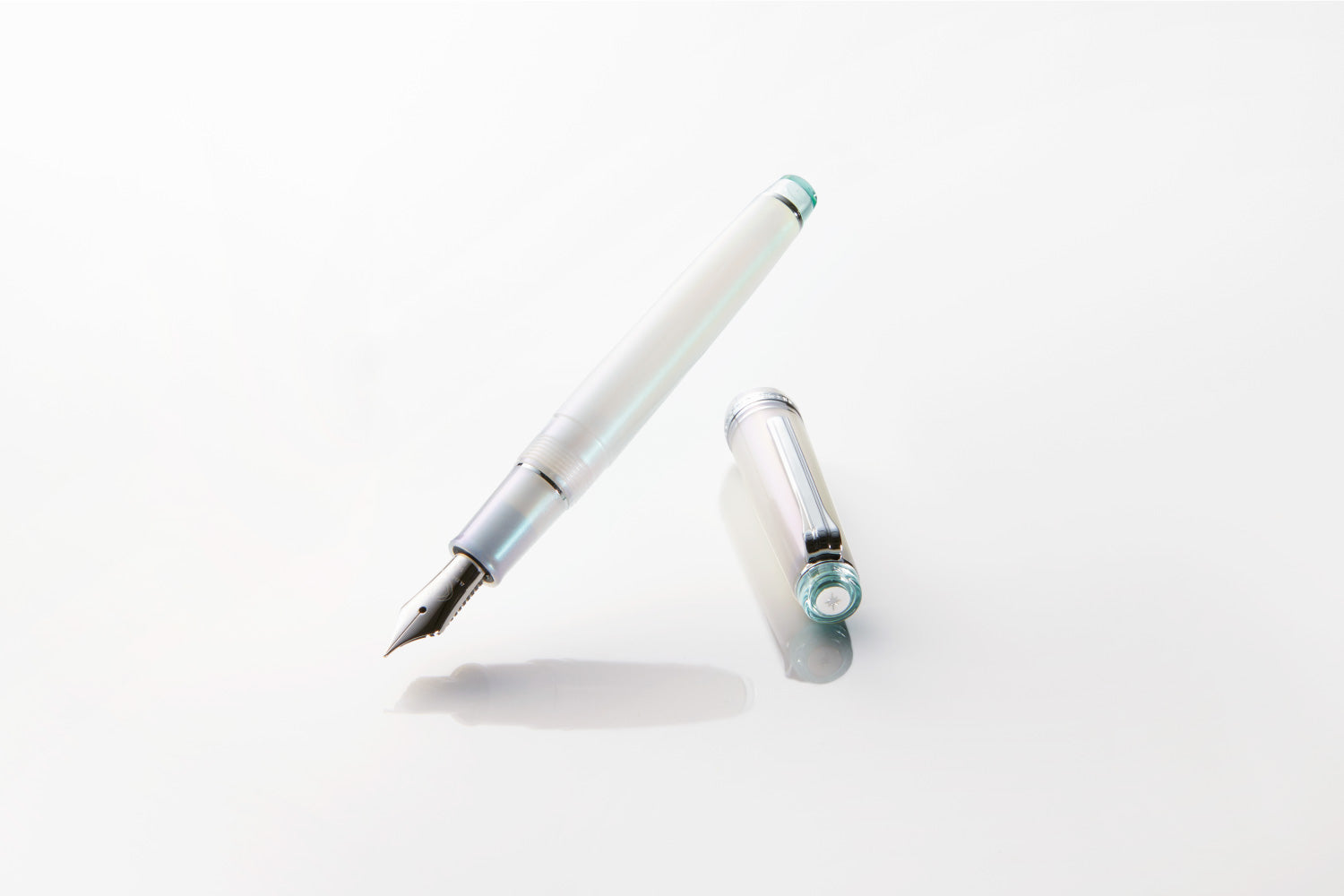 インク「ancora」の、爽やかで清々しいブルーグリーンのカラーをそのままモチーフにした蓋栓と尾栓。本体は、見る角度によって異なる偏光パールの輝きが美しい、ホワイトです。14金のペン先にはアンコーラのシンボルロゴを、蓋栓には導きと不変のシンボルである北極星をシルバー箔で施しました。字幅は、F(細字)、MF(中細字)、M(中字)の3種類です。